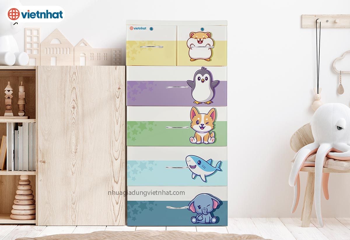 - Tủ nhựa Lucky 5T Việt Nhật được thiết kế nhiều ngăn vô cùng tiện lợi, tiết kiệm diện tích dùng để đựng đồ sơ sinh, quần áo người lớn, trẻ em, đồ dùng gia đình, ngăn kéo rộng rãi không sử dụng ray cơ mà trượt trên bánh xe nên cực kì bền